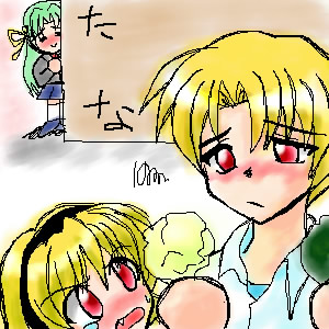 ![]() | 『 右か、左か。それが問題だ(笑) 』 悟史「う〜ん……」 沙都子「どうしたんですの、にーにー」 悟史「ああ、うん。ちょっと困ってるんだ」 沙都子「全く、にーにーはしょうがないですわねぇ。私がいないと何も出来ないんですから。 で、何を悩んでいるんですの?」 悟史「……ブロッコリーって、どっちだったかな?」 沙都子「え?!そ、そんなの決まってますわ!青いのがブロッコリーで……あれ?緑ですの?緑がカリフラワ……ブロッコリ……?青で緑で、黄色……?ま、待っててくださいましね、にーにー。ちゃんとわかってるんですのよ!!わかってるんだからぁ!!」 悟史「……むぅ。うん、ありがとう、沙都子」 自サイト絵板。詩音絵で暗かった後なので明るく(笑) 北条兄妹にきゅんきゅん☆(笑) ……後ろの怪しい人が私の代理ではないことを信じたい(笑) |