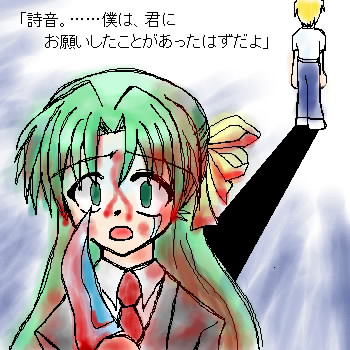 ![]() | 『鬼の心、解ける時。』 私のような斜な人間が、彼のような人に惹かれたのがそもそもの間違いだったのでしょうか。 あはははは。駄目。 私には悟史くんとの出会いを否定することなんてできないよ。 じゃあ、園崎の双子に生まれなければ良かったのかな。 ……これも駄目。 あんなひどい目にあわせておいて、だけど私は詩音が好きだったから。 どんな可能性を上げ連ねても、結局行きつく先は同じ。 そう。あの時間違えた私がいけなかった。 私が悟史くんとの約束を守っていればきっとこんなことにはならなかったのだ。 悟史くん、ごめん。沙都子もごめん。詩音にも、ごめん。 みんなみんな、ごめんなさい。 私は天国にはいけないから、ここで叫ぶしかないけれど。 ……生まれてきて、ごめんなさい。 |