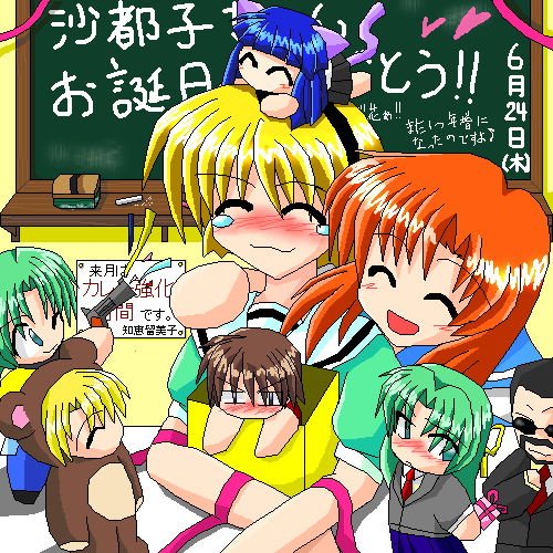 大切な人をなくしてしまった日だったから。 そして彼女は己が罪を背負い続ける。 戒めの日だと、彼女は言った。 自分の弱さを思い知った日だったから。 そして彼女は己に強さを強い続ける。 それでも私は祝いたい。 大好きなあなたが生まれてくれた、大事な大事な日なのだから。 きっと皆もあなたを愛し続けたいから。 どうか、あなたに幸せを。 ……Happy Birthday,沙都子! な〜んて…詩って何故か恥ずかしいです(ならやるな(笑) 画力も文才も詩才もないけど、愛だけはっ! 総描画時間約12時間。こんなに時間かけて絵描いたの生まれて初めてです。 ……ちなみに。 説明しておかないと誤解されそうな気もするので1箇所だけ注釈をば(注釈つけなきゃわからない絵って…) 詩音は葛西さんにプレゼントを渡そうとしてるわけではないです(笑) 詩音ってお祝いの言葉とか素直に言えなさそうなので……後ろ手にプレゼントを隠したままでいるのを葛西さんが微笑ましく見守っている、というつもりで描いてます(笑) あと、手前のキャラのほうが小さい気がしますが、きっとキャラごとに縮尺が皆違うんです!(マテ) |
