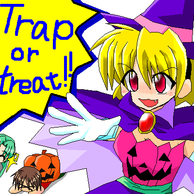 | 沙都子「Trap or treat!!ですわー♪」 圭一「ちょっと待て沙都子ッ!その危険で確信犯な間違いは脅迫と同じだぞッ!? って、うわーーーー!?」 沙都子「……カボチャは嫌いですけれど、さすがにトラップに使った時の破壊力は抜群ですわね……」 圭一「お・前・なぁー!!感心してないでさっさとどけろーっ!」 詩音「どかしちゃうんですか?勿体無いです、圭ちゃん。ものすごく似合ってますよ?」 圭一「な……っ詩音!?」 沙都子「飛んで火にいる詩音さんとはこのことですわね! Trap or treat!ですわ!」 詩音「……(ニコニコ)」 沙都子「(ぞく)……な、なんですの、その笑みは?」 詩音「いえいえ。お菓子ならちゃあんと用意してありますから。 ……パンプキンパイにパンプキンケーキ、パンプキンパン。 さぁお好きなのを選んじゃってください♪(ニヤリ)」 沙都子「ふ、ふわぁぁああああん、カ、カボチャは嫌ですのーっ(泣)」 ハロウィンの日に描いたハロウィン絵です〜♪ 雛見沢のハロウィンではこう言うのが普通です(嘘だッ!(笑) でも、ハロウィン関連で売ってるお菓子ってカボチャのばっかりなんですよね。 沙都子はTreatより専らTrapに走ることになりそうです(笑) ……そして描いてる時は自覚なかったのですが、「大胆な服だ」とレスで皆様に連呼されました……言われてみれば、確かに(笑) |