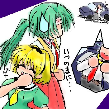 | 大高「……な、何が私が殺される、だ!いつまでもこんな茶番を見ていられるか! やはりここは射撃命令を……って、うわ、なんだ、これは!? U字ロックが窓枠に……?? だ、誰だか知らないが外したまえ!おい……?! 誰か、誰か外してくれーーーーっ!!」 沙都子「をーっほっほ!!レナさんを射殺しろなどと言う輩には当然の報いですわー♪」 沙都子支援絵第3弾! 罪滅し編より、正しいU字ロックの再利用法w 沙都子のこんな影の活躍に一票を!……な〜んて(笑) 前回レスの羽二重さんの大高さん支援で思いついて思わず描いてしまいましたが……よく考えたらこれ、沙都子支援になってるんだろうか……?(汗) 別に絵として面白いわけじゃないしなぁ……。 と、いうわけで投稿後かなり消したくなった1枚です(^^; 昔描いた沙都梨花絵のように削除→封印されなかったのは奇跡です(笑) |