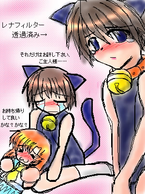 圭一「沙都子捕獲完了!行け、詩音!」 詩音「ナイスです、圭ちゃん☆さぁ沙都子、あ〜ん♪」 沙都子「じょ、冗談ではございませんわー!?」 詩音「偏食は許しませんよ♪悟史くんにも頼まれているんですよ? 『手段は問わないから沙都子の好き嫌いを完全になくして欲しい』って」 沙都子「う、ううううう、嘘ですわ、そんなのー!? にーにーがそんなこというはずありませんもの!!! 圭一さんも後生ですから離してくださいましーっ!!」 圭一「……許せ、沙都子。俺も辛いが、これもにーにーの務めだ」 沙都子「全然辛そうに見えませんでしてよー!?り、梨花ぁ!」 梨花「……沙都子、あとで撫で撫でしてあげますですよ☆」 沙都子「それは結構ですから今助けてくださいましー!」 梨花「にぱ〜☆」 沙都子「ふ、ふわぁぁぁぁあん!」 詩音「隙ありですっ!えい!」 沙都子「!!!(涙)」 〜レナ・魅音サイド〜 レナ「はぅ〜慌てる沙都子ちゃんかぁいい!笑ってる圭一くんも詩ぃちゃんも梨花ちゃんもみんなかぁいいよぅ〜vvお、おも…」 魅音「ちょ、ちょっと待った、レナ!!お持ち帰りはダメだって!! ほら、おじさんが写真とって後で焼き増ししてあげるから!」 レナ「う、うん、じゃあ我慢するね〜ありがとう魅ぃちゃん。 我慢して……見てるだけ、見てるだけなんだよ〜☆はぅ〜〜〜vv」 魅音「(そろそろおじさんじゃ抑えられないなぁ)……えい!」 『パシャ!』 ……って、感じかなぁ(笑) ちなみにこれはjpgで色が変わる前のをpng保存したものです(そのせいで重いですが(笑) |